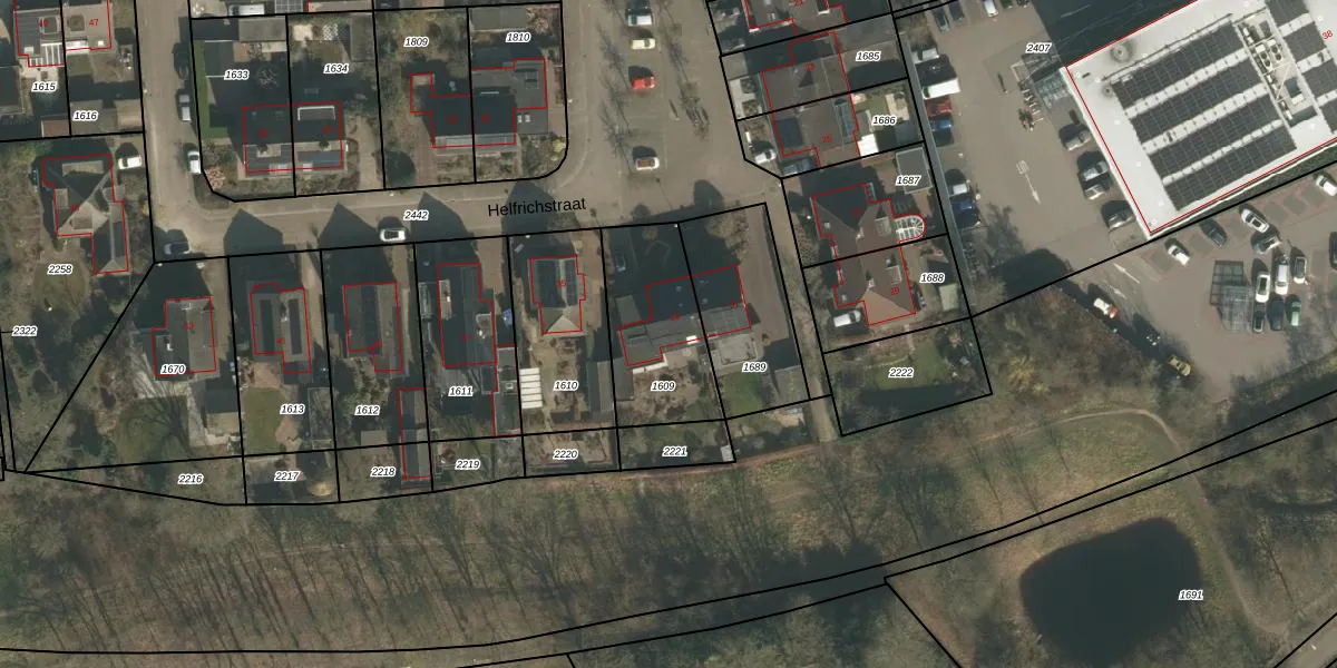 Helfrichstraat 33 is gelegen op kadastraal perceel GBK00E1609. Deze kadastrale aanduiding is uniek en wordt gebruikt door het Kadaster om eigendomsrechten en andere zakelijke rechten vast te leggen. Het perceel maakt onderdeel uit van de kadastrale gemeente Groesbeek.