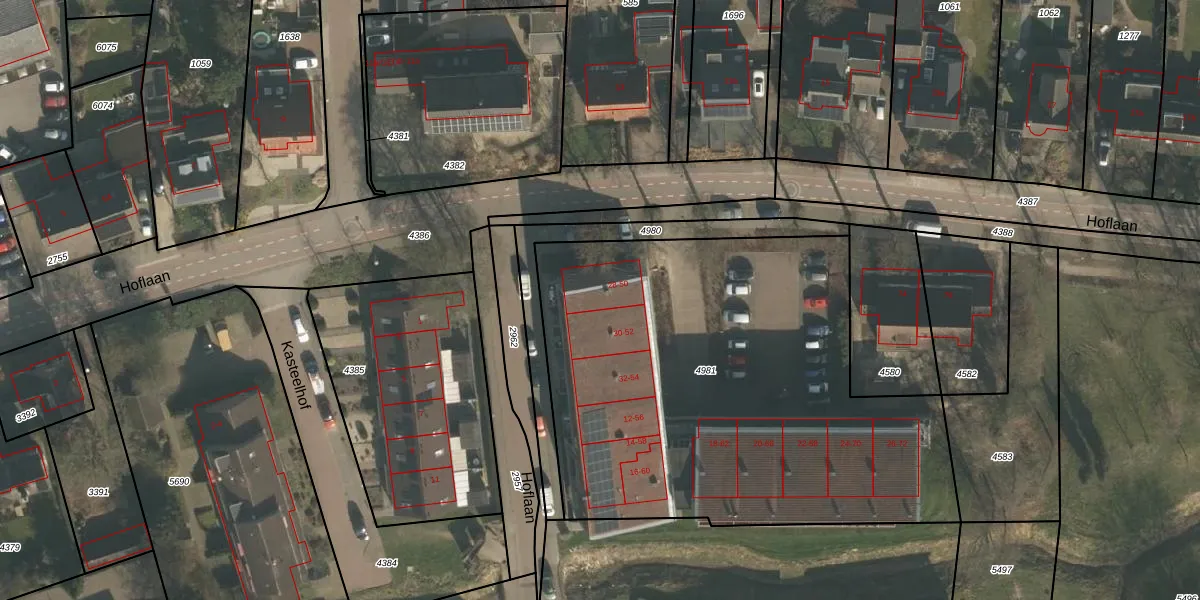 Hoflaan 50 is gelegen op kadastraal perceel GBK00L4981. Deze kadastrale aanduiding is uniek en wordt gebruikt door het Kadaster om eigendomsrechten en andere zakelijke rechten vast te leggen. Het perceel maakt onderdeel uit van de kadastrale gemeente Groesbeek.