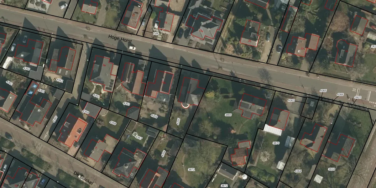 Het perceel waarop Hoge Horst 12 staat heeft een oppervlakte van 466 m². Dit is een groot perceel. De perceeloppervlakte wordt geregistreerd door het Kadaster. Gedetailleerde informatie over de maten van dit perceel kunt u vinden in het rapport Kadastrale kaart met maatvoering van Hoge Horst 12.