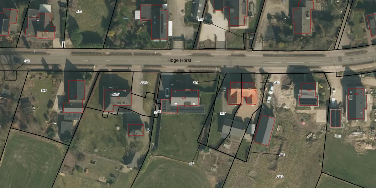 Het perceel waarop Hoge Horst 32-a staat heeft een oppervlakte van 5684 m². Dit is een zeer groot perceel. De perceeloppervlakte wordt geregistreerd door het Kadaster. Gedetailleerde informatie over de maten van dit perceel kunt u vinden in het rapport Kadastrale kaart met maatvoering van Hoge Horst 32-a.