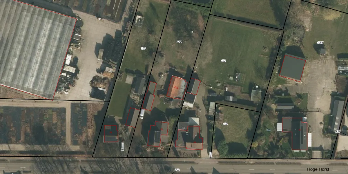 Hoge Horst 41-a is gelegen op kadastraal perceel GBK00P121. Deze kadastrale aanduiding is uniek en wordt gebruikt door het Kadaster om eigendomsrechten en andere zakelijke rechten vast te leggen. Het perceel maakt onderdeel uit van de kadastrale gemeente Groesbeek.