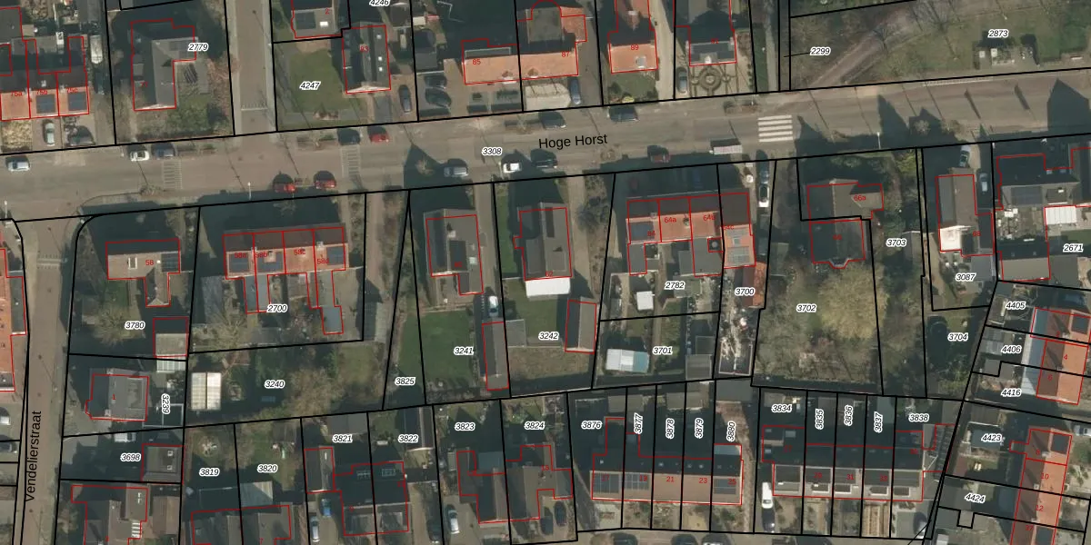 Het perceel waarop Hoge Horst 62 staat heeft een oppervlakte van 735 m². Dit is een groot perceel. De perceeloppervlakte wordt geregistreerd door het Kadaster. Gedetailleerde informatie over de maten van dit perceel kunt u vinden in het rapport Kadastrale kaart met maatvoering van Hoge Horst 62.