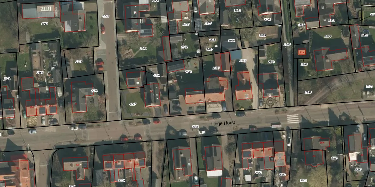 Het perceel waarop Hoge Horst 85 staat heeft een oppervlakte van 560 m². Dit is een groot perceel. De perceeloppervlakte wordt geregistreerd door het Kadaster. Gedetailleerde informatie over de maten van dit perceel kunt u vinden in het rapport Kadastrale kaart met maatvoering van Hoge Horst 85.
