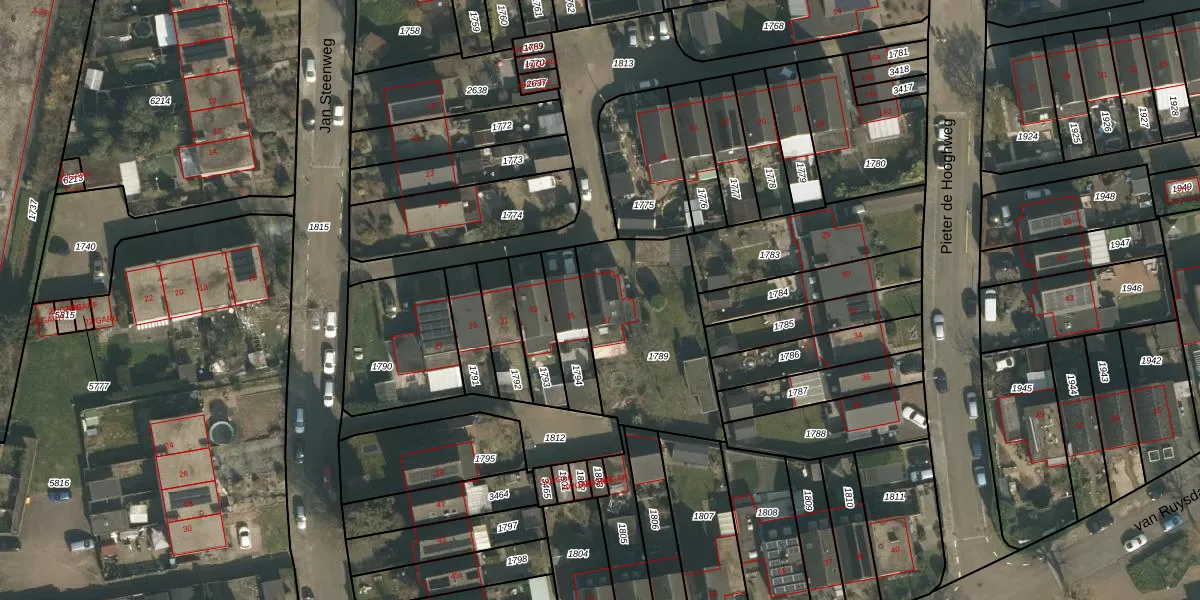 Het perceel waarop Jan Steenweg 37 staat heeft een oppervlakte van 614 m². Dit is een groot perceel. De perceeloppervlakte wordt geregistreerd door het Kadaster. Gedetailleerde informatie over de maten van dit perceel kunt u vinden in het rapport Kadastrale kaart met maatvoering van Jan Steenweg 37.