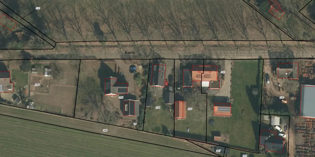 Het perceel waarop Kamp 16 staat heeft een oppervlakte van 845 m². Dit is een groot perceel. De perceeloppervlakte wordt geregistreerd door het Kadaster. Gedetailleerde informatie over de maten van dit perceel kunt u vinden in het rapport Kadastrale kaart met maatvoering van Kamp 16.