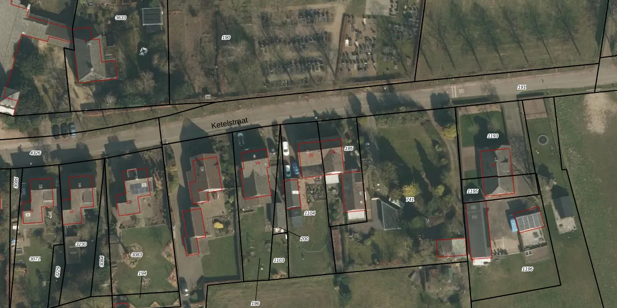 Ketelstraat 20 is gelegen op kadastraal perceel GBK00P1104. Deze kadastrale aanduiding is uniek en wordt gebruikt door het Kadaster om eigendomsrechten en andere zakelijke rechten vast te leggen. Het perceel maakt onderdeel uit van de kadastrale gemeente Groesbeek.