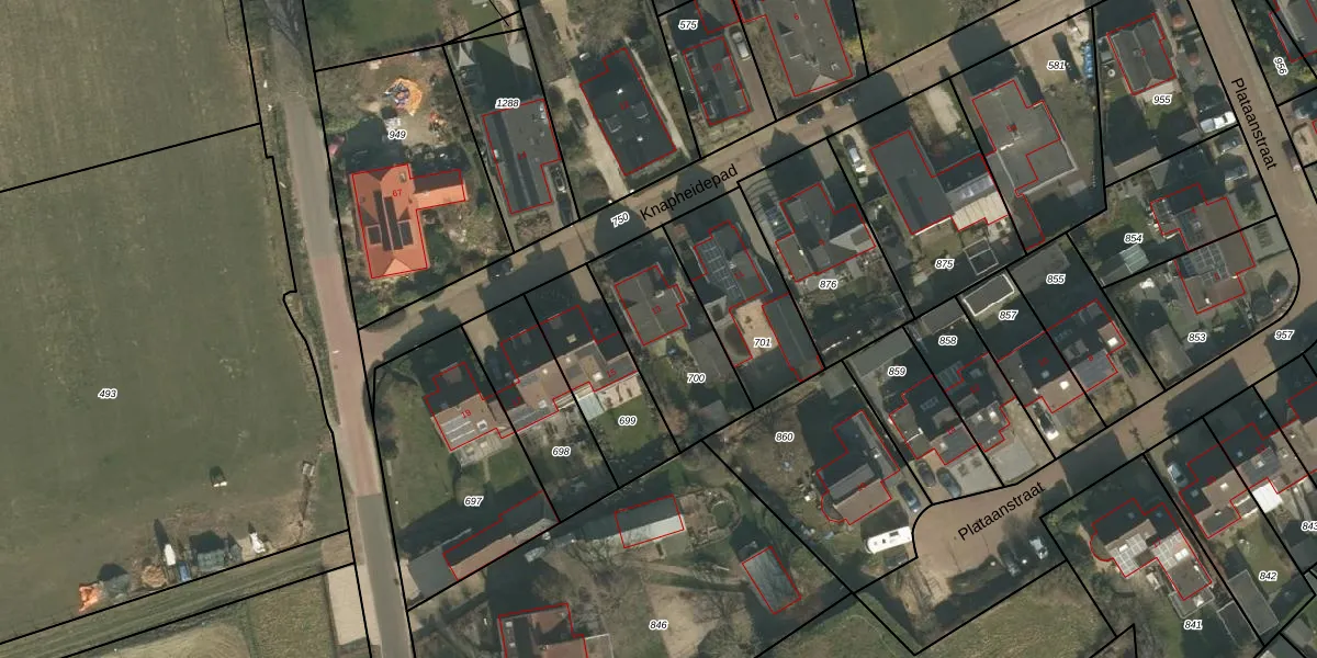 Knapheidepad 13 is gelegen op kadastraal perceel GBK00M700. Deze kadastrale aanduiding is uniek en wordt gebruikt door het Kadaster om eigendomsrechten en andere zakelijke rechten vast te leggen. Het perceel maakt onderdeel uit van de kadastrale gemeente Groesbeek.