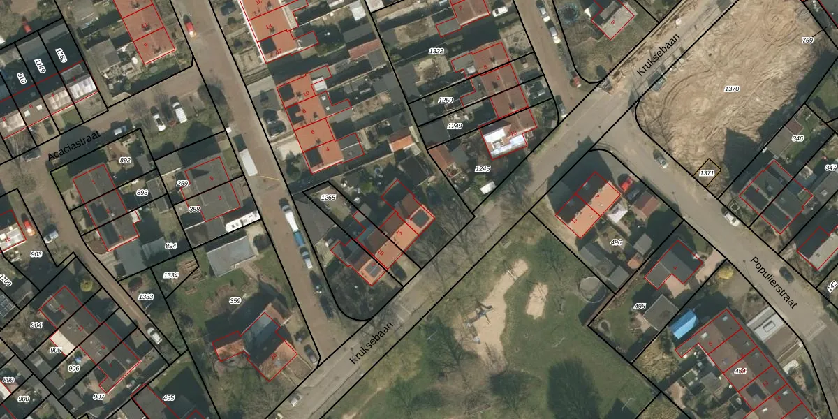 Het perceel waarop Kruksebaan 14 staat heeft een oppervlakte van 8844 m². Dit is een zeer groot perceel. De perceeloppervlakte wordt geregistreerd door het Kadaster. Gedetailleerde informatie over de maten van dit perceel kunt u vinden in het rapport Kadastrale kaart met maatvoering van Kruksebaan 14.