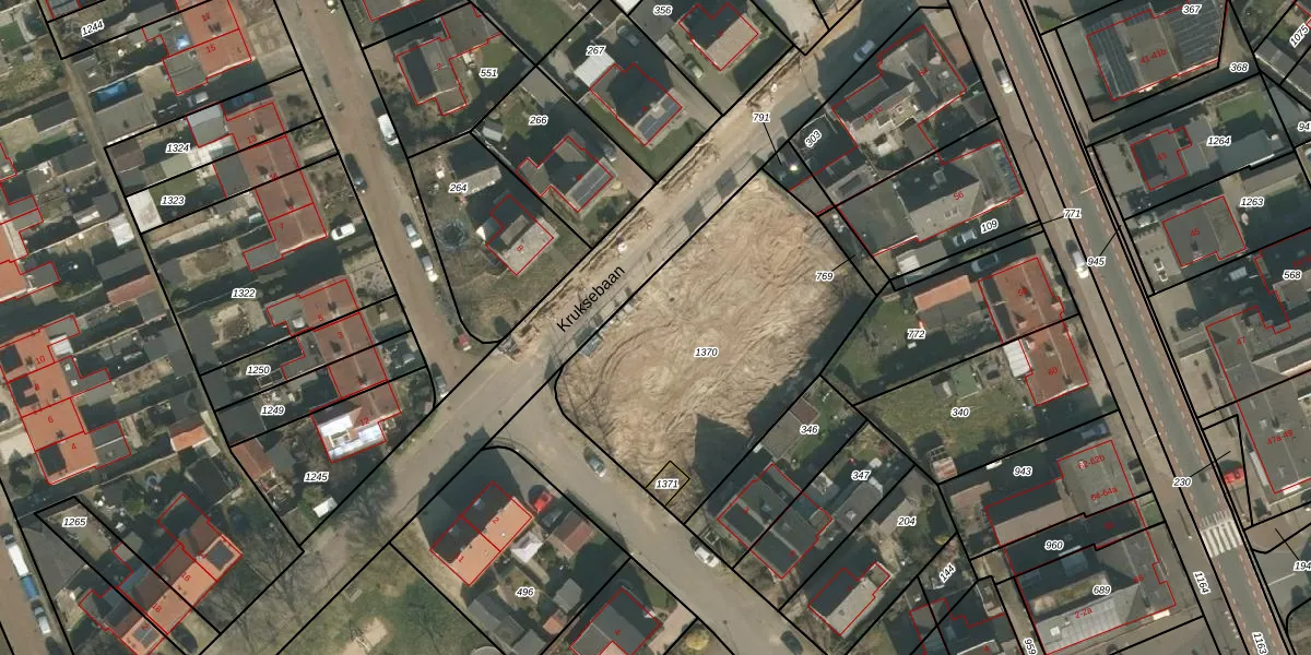Het perceel waarop Kruksebaan 5-b staat heeft een oppervlakte van 1346 m². Dit is een zeer groot perceel. De perceeloppervlakte wordt geregistreerd door het Kadaster. Gedetailleerde informatie over de maten van dit perceel kunt u vinden in het rapport Kadastrale kaart met maatvoering van Kruksebaan 5-b.