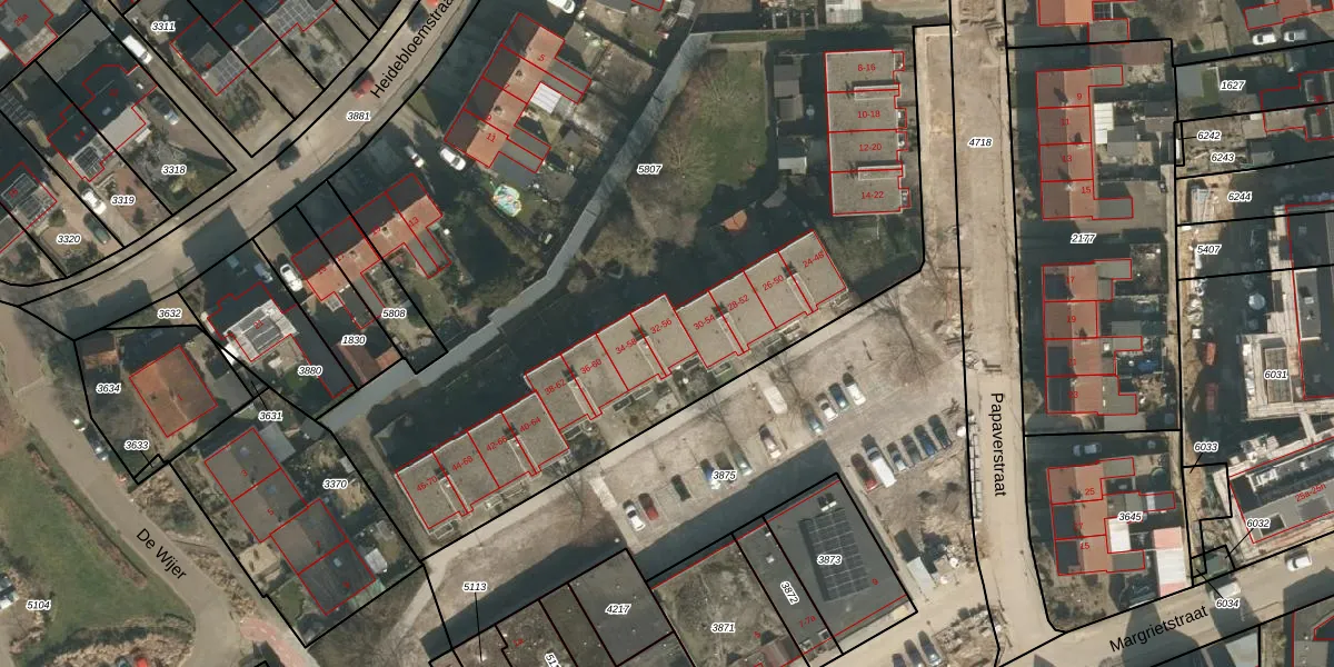 Het perceel waarop Papaverstraat 42 staat heeft een oppervlakte van 6640 m². Dit is een zeer groot perceel. De perceeloppervlakte wordt geregistreerd door het Kadaster. Gedetailleerde informatie over de maten van dit perceel kunt u vinden in het rapport Kadastrale kaart met maatvoering van Papaverstraat 42.