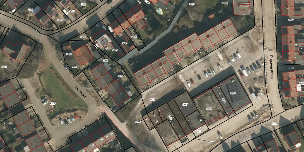 Het perceel waarop Papaverstraat 64 staat heeft een oppervlakte van 6640 m². Dit is een zeer groot perceel. De perceeloppervlakte wordt geregistreerd door het Kadaster. Gedetailleerde informatie over de maten van dit perceel kunt u vinden in het rapport Kadastrale kaart met maatvoering van Papaverstraat 64.