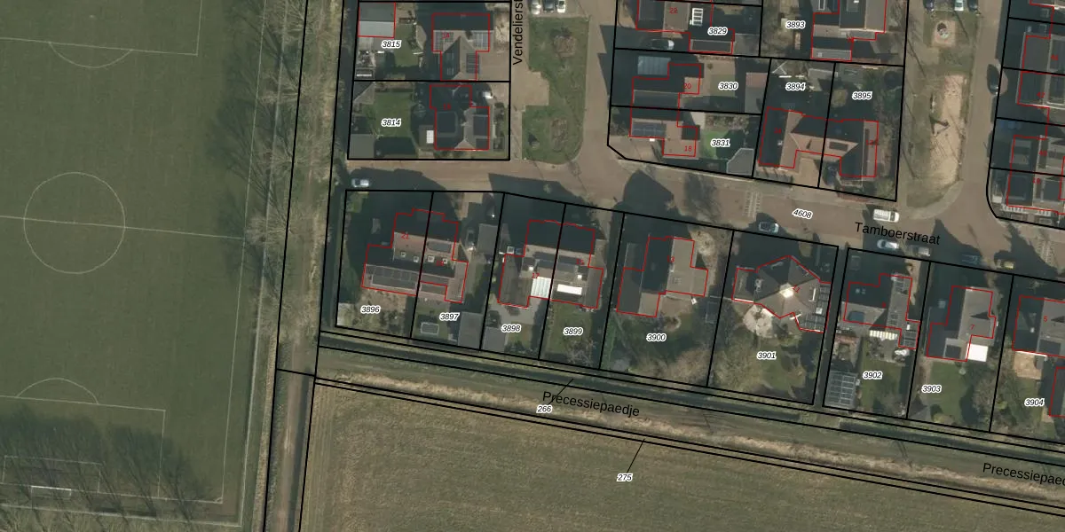 Het perceel waarop Tamboerstraat 17 staat heeft een oppervlakte van 345 m². Dit is een groot perceel. De perceeloppervlakte wordt geregistreerd door het Kadaster. Gedetailleerde informatie over de maten van dit perceel kunt u vinden in het rapport Kadastrale kaart met maatvoering van Tamboerstraat 17.