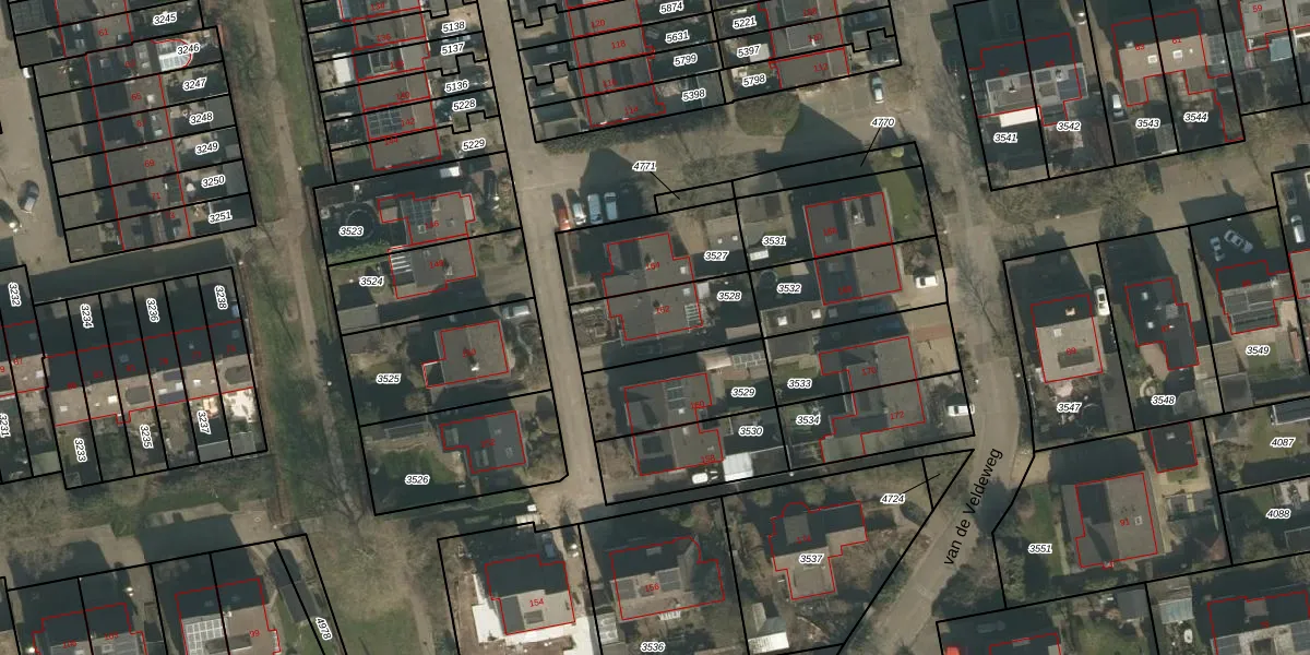 van de Veldeweg 162 is gelegen op kadastraal perceel GBK00L3528. Deze kadastrale aanduiding is uniek en wordt gebruikt door het Kadaster om eigendomsrechten en andere zakelijke rechten vast te leggen. Het perceel maakt onderdeel uit van de kadastrale gemeente Groesbeek.