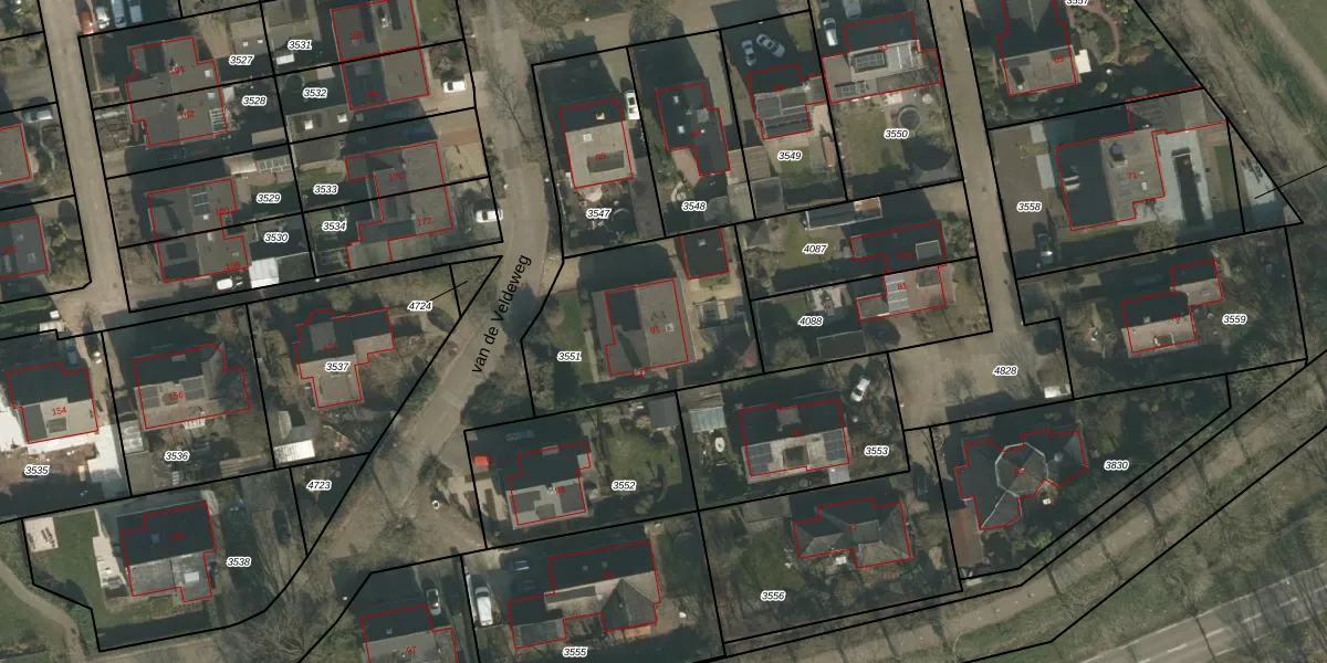 van de Veldeweg 91 is gelegen op kadastraal perceel GBK00L3551. Deze kadastrale aanduiding is uniek en wordt gebruikt door het Kadaster om eigendomsrechten en andere zakelijke rechten vast te leggen. Het perceel maakt onderdeel uit van de kadastrale gemeente Groesbeek.