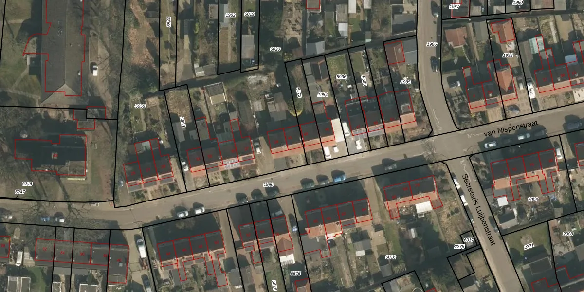 Het perceel waarop van Nispenstraat 41 staat heeft een oppervlakte van 4259 m². Dit is een zeer groot perceel. De perceeloppervlakte wordt geregistreerd door het Kadaster. Gedetailleerde informatie over de maten van dit perceel kunt u vinden in het rapport Kadastrale kaart met maatvoering van van Nispenstraat 41.