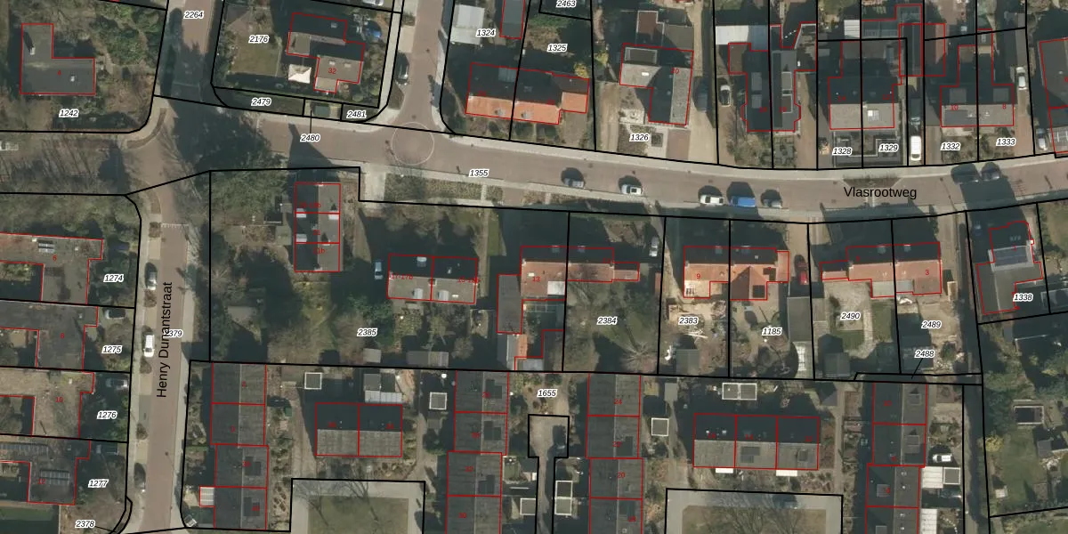 Vlasrootweg 13 is gelegen op kadastraal perceel GBK00E2385. Deze kadastrale aanduiding is uniek en wordt gebruikt door het Kadaster om eigendomsrechten en andere zakelijke rechten vast te leggen. Het perceel maakt onderdeel uit van de kadastrale gemeente Groesbeek.