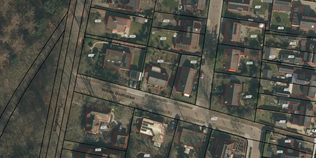 William Boothstraat 1 is gelegen op kadastraal perceel GBK00E1483. Deze kadastrale aanduiding is uniek en wordt gebruikt door het Kadaster om eigendomsrechten en andere zakelijke rechten vast te leggen. Het perceel maakt onderdeel uit van de kadastrale gemeente Groesbeek.