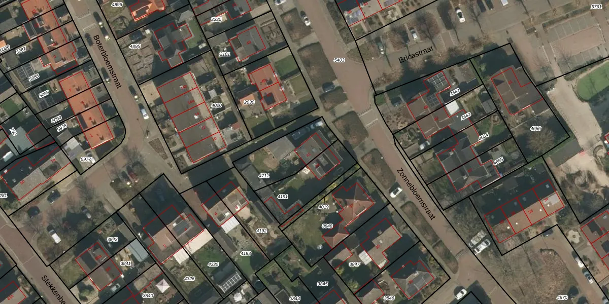 Het perceel waarop Zonnebloemstraat 41 staat heeft een oppervlakte van 380 m². Dit is een groot perceel. De perceeloppervlakte wordt geregistreerd door het Kadaster. Gedetailleerde informatie over de maten van dit perceel kunt u vinden in het rapport Kadastrale kaart met maatvoering van Zonnebloemstraat 41.