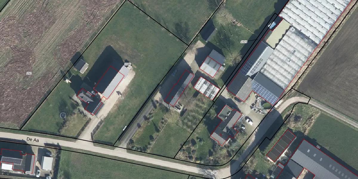Het perceel waarop De Aa 9 staat heeft een oppervlakte van 5526 m². Dit is een zeer groot perceel. De perceeloppervlakte wordt geregistreerd door het Kadaster. Gedetailleerde informatie over de maten van dit perceel kunt u vinden in het rapport Kadastrale kaart met maatvoering van De Aa 9.