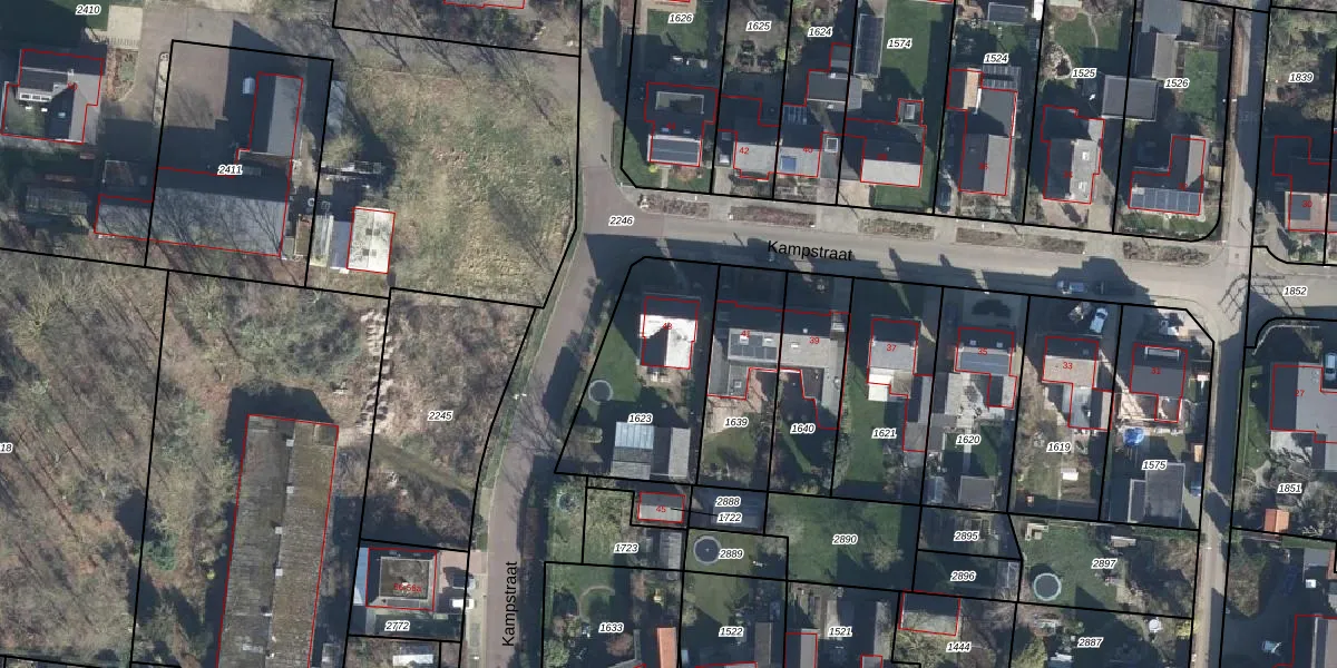 Het perceel waarop Kampstraat 43 staat heeft een oppervlakte van 566 m². Dit is een groot perceel. De perceeloppervlakte wordt geregistreerd door het Kadaster. Gedetailleerde informatie over de maten van dit perceel kunt u vinden in het rapport Kadastrale kaart met maatvoering van Kampstraat 43.