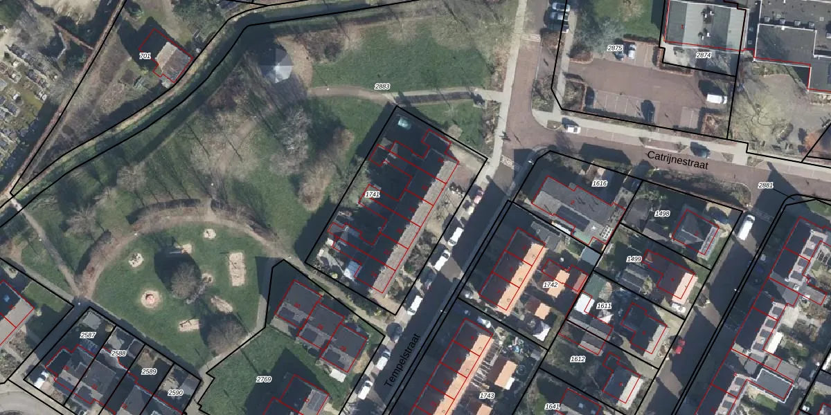 Het perceel waarop Tempelstraat 18 staat heeft een oppervlakte van 1102 m². Dit is een zeer groot perceel. De perceeloppervlakte wordt geregistreerd door het Kadaster. Gedetailleerde informatie over de maten van dit perceel kunt u vinden in het rapport Kadastrale kaart met maatvoering van Tempelstraat 18.