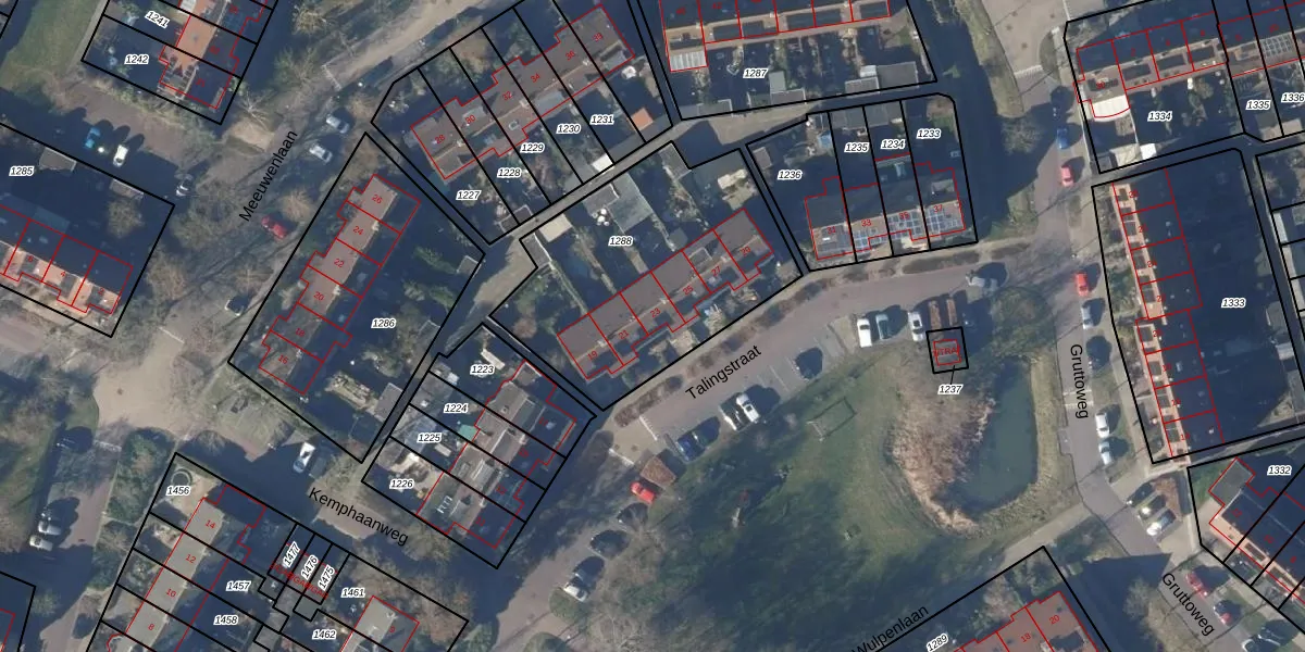 Het perceel waarop Talingstraat 23 staat heeft een oppervlakte van 1104 m². Dit is een zeer groot perceel. De perceeloppervlakte wordt geregistreerd door het Kadaster. Gedetailleerde informatie over de maten van dit perceel kunt u vinden in het rapport Kadastrale kaart met maatvoering van Talingstraat 23.
