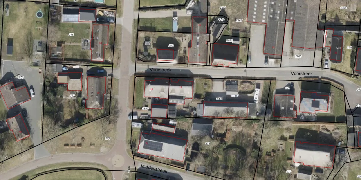 Voorstreek 11 is gelegen op kadastraal perceel RDE00T1588. Deze kadastrale aanduiding is uniek en wordt gebruikt door het Kadaster om eigendomsrechten en andere zakelijke rechten vast te leggen. Het perceel maakt onderdeel uit van de kadastrale gemeente Rolde.