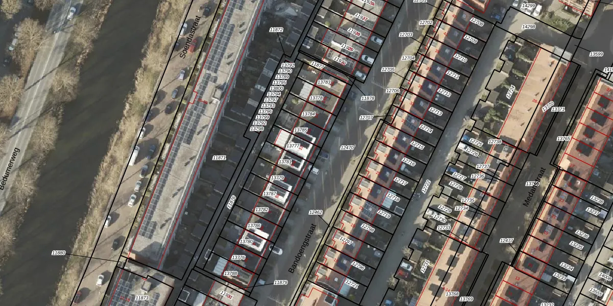 Bandoengstraat 12 is gelegen op kadastraal perceel GNG00A13777. Deze kadastrale aanduiding is uniek en wordt gebruikt door het Kadaster om eigendomsrechten en andere zakelijke rechten vast te leggen. Het perceel maakt onderdeel uit van de kadastrale gemeente Groningen.