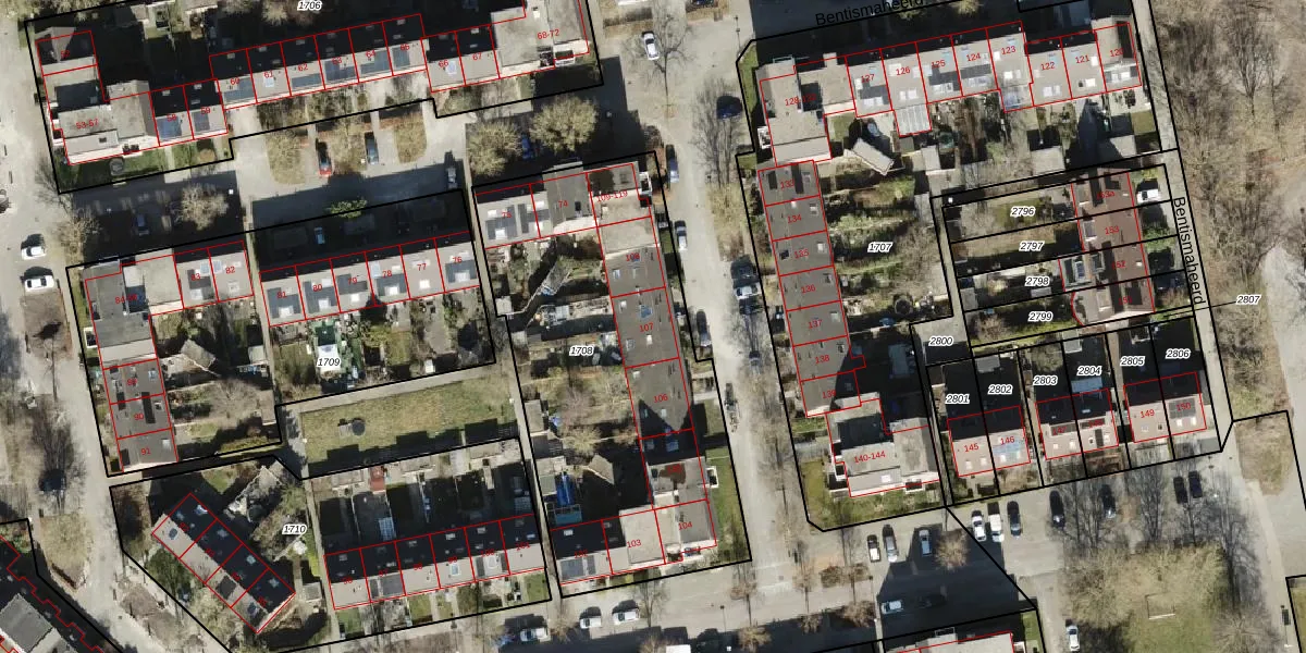Bentismaheerd 107 is gelegen op kadastraal perceel GNG01AB1708. Deze kadastrale aanduiding is uniek en wordt gebruikt door het Kadaster om eigendomsrechten en andere zakelijke rechten vast te leggen. Het perceel maakt onderdeel uit van de kadastrale gemeente Groningen.