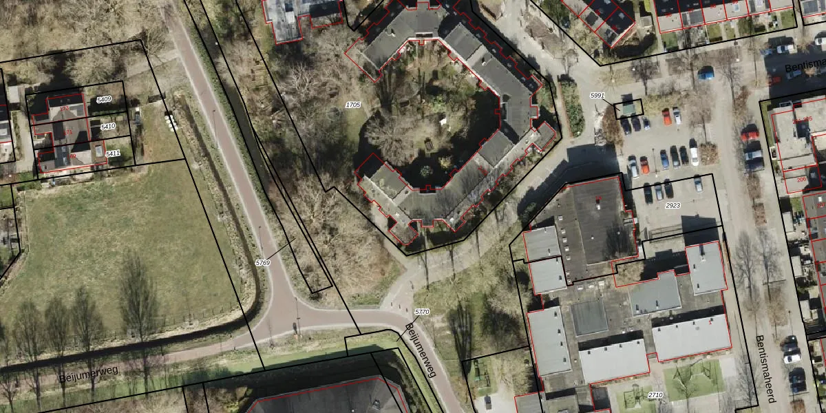 Het perceel waarop Bentismaheerd 4 staat heeft een oppervlakte van 6531 m². Dit is een zeer groot perceel. De perceeloppervlakte wordt geregistreerd door het Kadaster. Gedetailleerde informatie over de maten van dit perceel kunt u vinden in het rapport Kadastrale kaart met maatvoering van Bentismaheerd 4.