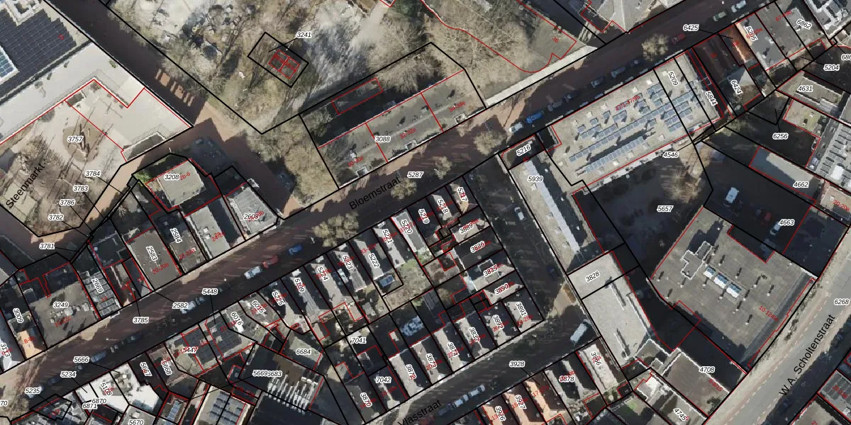 Het perceel waarop Bloemstraat 39-a staat heeft een oppervlakte van 54 m². Dit is een klein perceel. De perceeloppervlakte wordt geregistreerd door het Kadaster. Gedetailleerde informatie over de maten van dit perceel kunt u vinden in het rapport Kadastrale kaart met maatvoering van Bloemstraat 39-a.