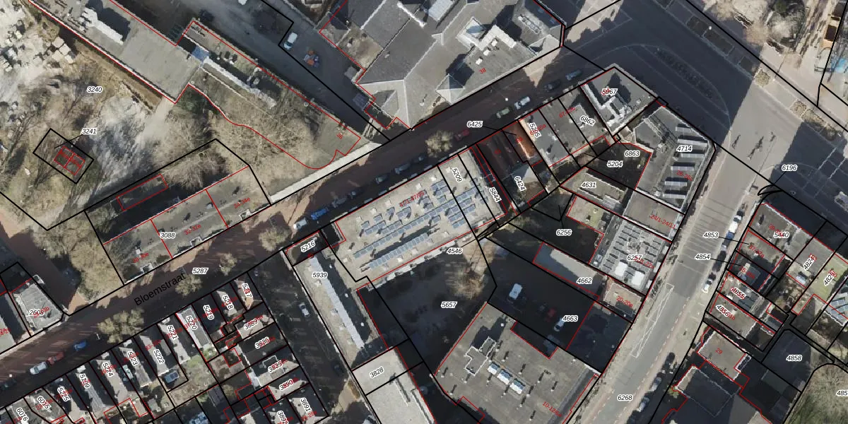 Het perceel waarop Bloemstraat 47-31 staat heeft een oppervlakte van 1854 m². Dit is een zeer groot perceel. De perceeloppervlakte wordt geregistreerd door het Kadaster. Gedetailleerde informatie over de maten van dit perceel kunt u vinden in het rapport Kadastrale kaart met maatvoering van Bloemstraat 47-31.