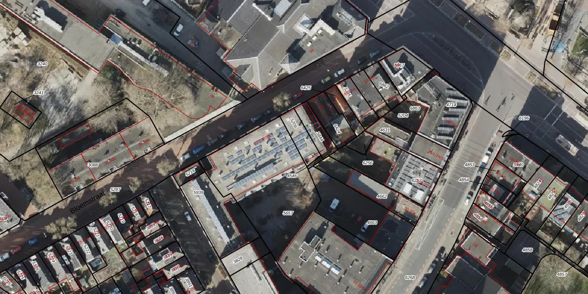 Het perceel waarop Bloemstraat 47-48 staat heeft een oppervlakte van 1854 m². Dit is een zeer groot perceel. De perceeloppervlakte wordt geregistreerd door het Kadaster. Gedetailleerde informatie over de maten van dit perceel kunt u vinden in het rapport Kadastrale kaart met maatvoering van Bloemstraat 47-48.