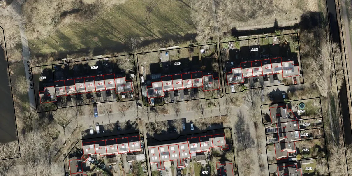 Het perceel waarop Boelemaheerd 128 staat heeft een oppervlakte van 1383 m². Dit is een zeer groot perceel. De perceeloppervlakte wordt geregistreerd door het Kadaster. Gedetailleerde informatie over de maten van dit perceel kunt u vinden in het rapport Kadastrale kaart met maatvoering van Boelemaheerd 128.