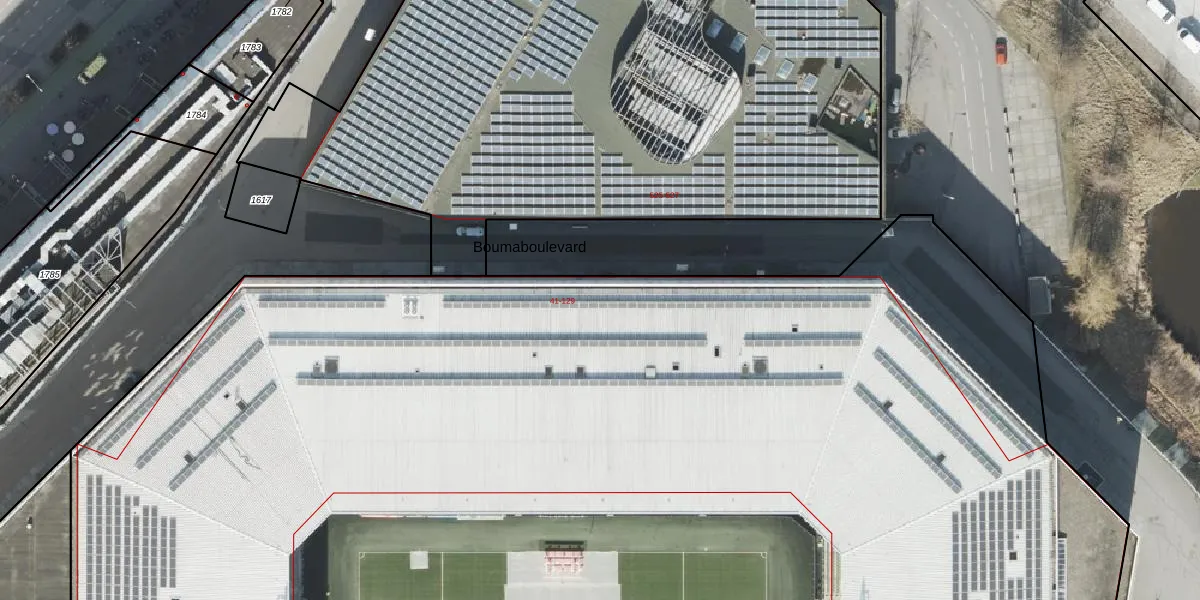 Het perceel waarop Boumaboulevard 63 staat heeft een oppervlakte van 3,3 ha. Dit is een zeer groot perceel. De perceeloppervlakte wordt geregistreerd door het Kadaster. Gedetailleerde informatie over de maten van dit perceel kunt u vinden in het rapport Kadastrale kaart met maatvoering van Boumaboulevard 63.