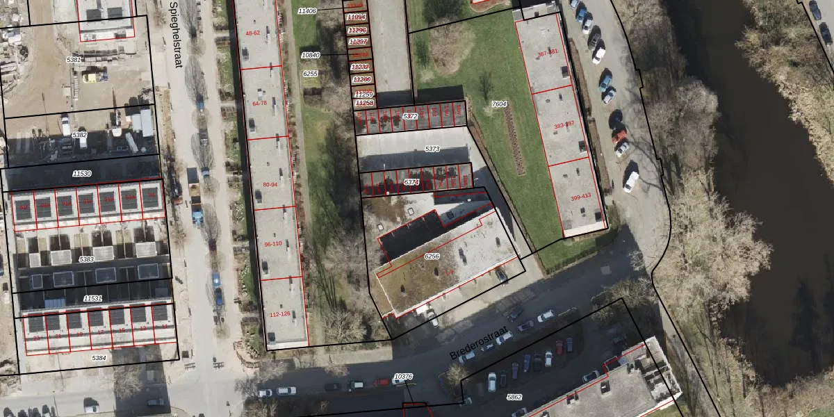 Het perceel waarop Brederostraat 1-n staat heeft een oppervlakte van 962 m². Dit is een groot perceel. De perceeloppervlakte wordt geregistreerd door het Kadaster. Gedetailleerde informatie over de maten van dit perceel kunt u vinden in het rapport Kadastrale kaart met maatvoering van Brederostraat 1-n.