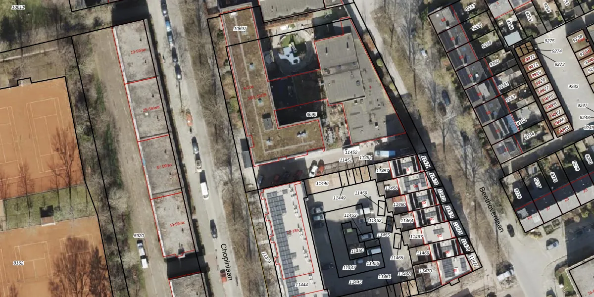 Het perceel waarop Chopinlaan 10-4 staat heeft een oppervlakte van 2428 m². Dit is een zeer groot perceel. De perceeloppervlakte wordt geregistreerd door het Kadaster. Gedetailleerde informatie over de maten van dit perceel kunt u vinden in het rapport Kadastrale kaart met maatvoering van Chopinlaan 10-4.