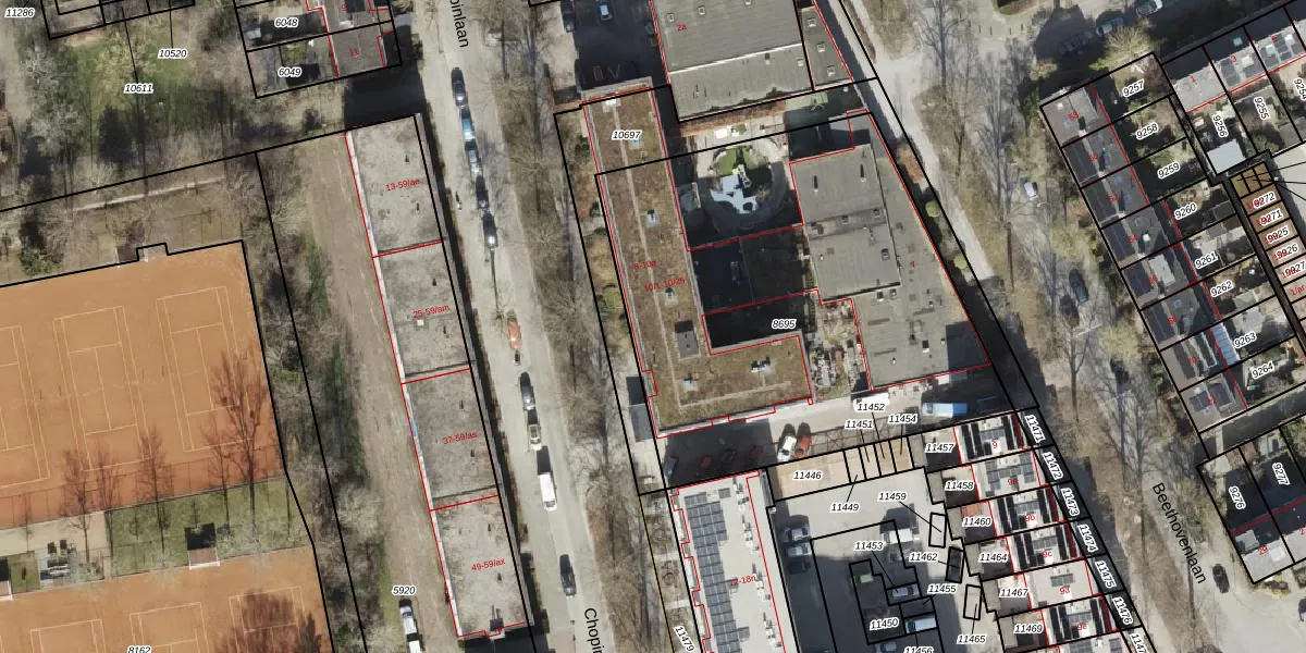 Het perceel waarop Chopinlaan 10-23 staat heeft een oppervlakte van 2428 m². Dit is een zeer groot perceel. De perceeloppervlakte wordt geregistreerd door het Kadaster. Gedetailleerde informatie over de maten van dit perceel kunt u vinden in het rapport Kadastrale kaart met maatvoering van Chopinlaan 10-23.