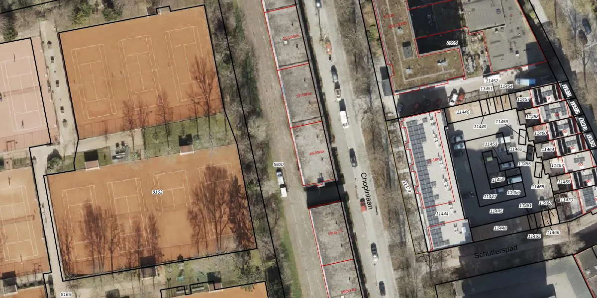 Het perceel waarop Chopinlaan 59-av staat heeft een oppervlakte van 3700 m². Dit is een zeer groot perceel. De perceeloppervlakte wordt geregistreerd door het Kadaster. Gedetailleerde informatie over de maten van dit perceel kunt u vinden in het rapport Kadastrale kaart met maatvoering van Chopinlaan 59-av.