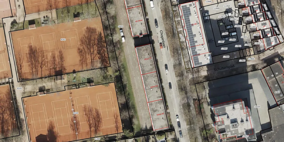 Het perceel waarop Chopinlaan 59-bb staat heeft een oppervlakte van 3700 m². Dit is een zeer groot perceel. De perceeloppervlakte wordt geregistreerd door het Kadaster. Gedetailleerde informatie over de maten van dit perceel kunt u vinden in het rapport Kadastrale kaart met maatvoering van Chopinlaan 59-bb.