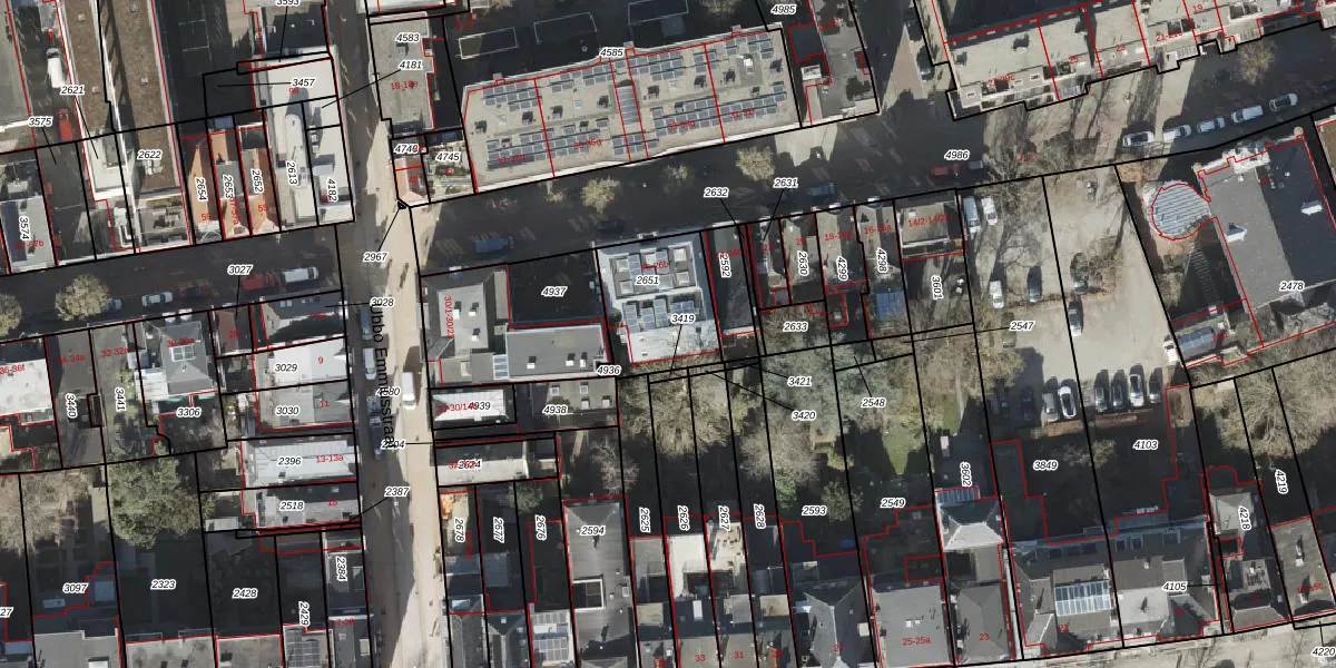 Het adres ligt op het perceel GNG00-I-2651, dat zich in de kadastrale gemeente Groningen bevindt. Het perceel is 328 m² groot. Dat is kleiner dan de gemiddelde perceeloppervlakte in Groningen, dat op 771,43 m² ligt. Het kleinste perceel in de kadastrale gemeente is 0 m² groot. De grootste perceeloppervlakte is 31,8 ha. Op het perceel zijn 20 adressen aanwezig. In de Basisregistratie Kadaster (BRK) werden de grenzen van het perceel geregistreerd op 03-09-2021.