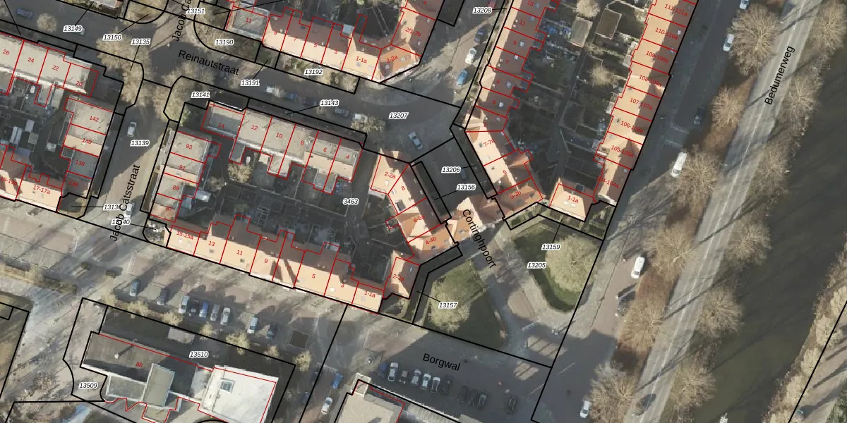 Het perceel waarop het adres ligt is GNG00-A-3463. De afkorting 'GNG00' staat voor kadastrale gemeente Groningen. De oppervlakte van het perceel is 2280 m². Dat is groter dan gemiddeld in Groningen, waar de gemiddelde perceeloppervlakte op 772,77 m² ligt. Het grootste perceel in de kadastrale gemeente is 31,8 ha. Het kleinste perceel heeft een oppervlakte van 0 m². Er zijn 30 adressen aanwezig op het perceel. De laatste wijziging in het de Basisregistratie Kadaster (BRK) was op 29-01-2013.