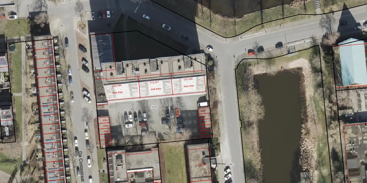 Het perceel waarop Da Costastraat 4-ap staat heeft een oppervlakte van 3421 m². Dit is een zeer groot perceel. De perceeloppervlakte wordt geregistreerd door het Kadaster. Gedetailleerde informatie over de maten van dit perceel kunt u vinden in het rapport Kadastrale kaart met maatvoering van Da Costastraat 4-ap.