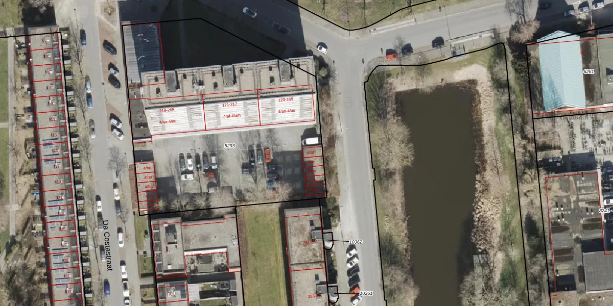 Het perceel waarop Da Costastraat 4-at staat heeft een oppervlakte van 3421 m². Dit is een zeer groot perceel. De perceeloppervlakte wordt geregistreerd door het Kadaster. Gedetailleerde informatie over de maten van dit perceel kunt u vinden in het rapport Kadastrale kaart met maatvoering van Da Costastraat 4-at.