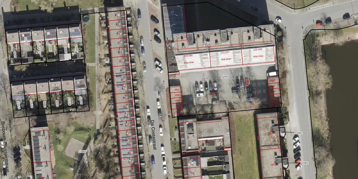 Het perceel waarop Da Costastraat 4-bc staat heeft een oppervlakte van 3421 m². Dit is een zeer groot perceel. De perceeloppervlakte wordt geregistreerd door het Kadaster. Gedetailleerde informatie over de maten van dit perceel kunt u vinden in het rapport Kadastrale kaart met maatvoering van Da Costastraat 4-bc.