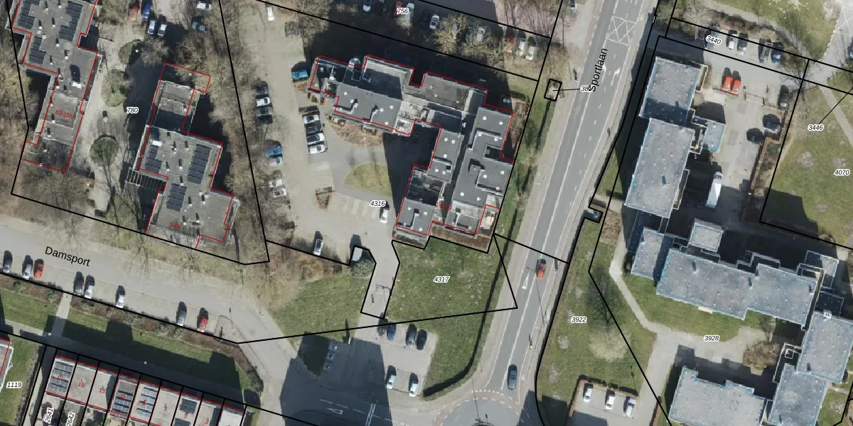 Het perceel waarop Damsport 1-3 staat heeft een oppervlakte van 3303 m². Dit is een zeer groot perceel. De perceeloppervlakte wordt geregistreerd door het Kadaster. Gedetailleerde informatie over de maten van dit perceel kunt u vinden in het rapport Kadastrale kaart met maatvoering van Damsport 1-3.
