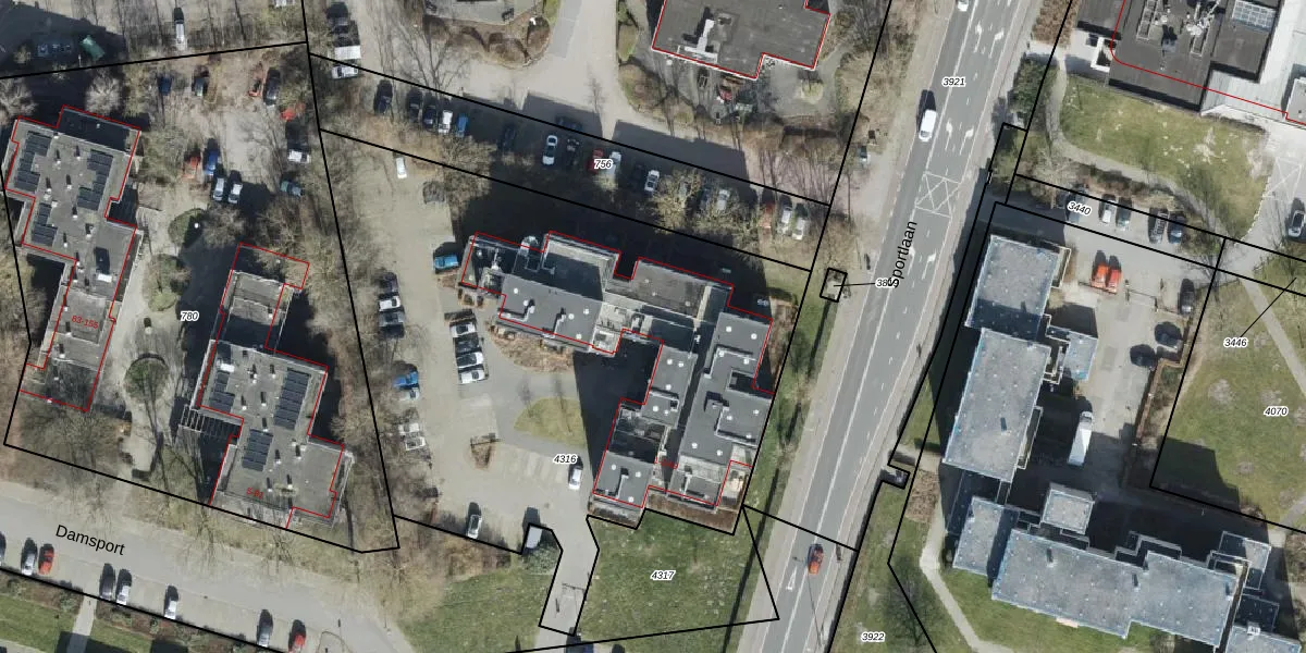 Het perceel waarop Damsport 1-36 staat heeft een oppervlakte van 3303 m². Dit is een zeer groot perceel. De perceeloppervlakte wordt geregistreerd door het Kadaster. Gedetailleerde informatie over de maten van dit perceel kunt u vinden in het rapport Kadastrale kaart met maatvoering van Damsport 1-36.