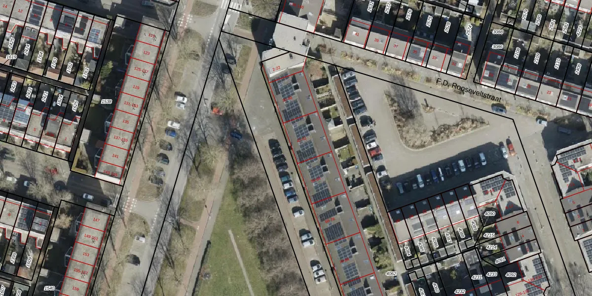 Het perceel waarop D.D. Eisenhowerstraat 46 staat heeft een oppervlakte van 2565 m². Dit is een zeer groot perceel. De perceeloppervlakte wordt geregistreerd door het Kadaster. Gedetailleerde informatie over de maten van dit perceel kunt u vinden in het rapport Kadastrale kaart met maatvoering van D.D. Eisenhowerstraat 46.