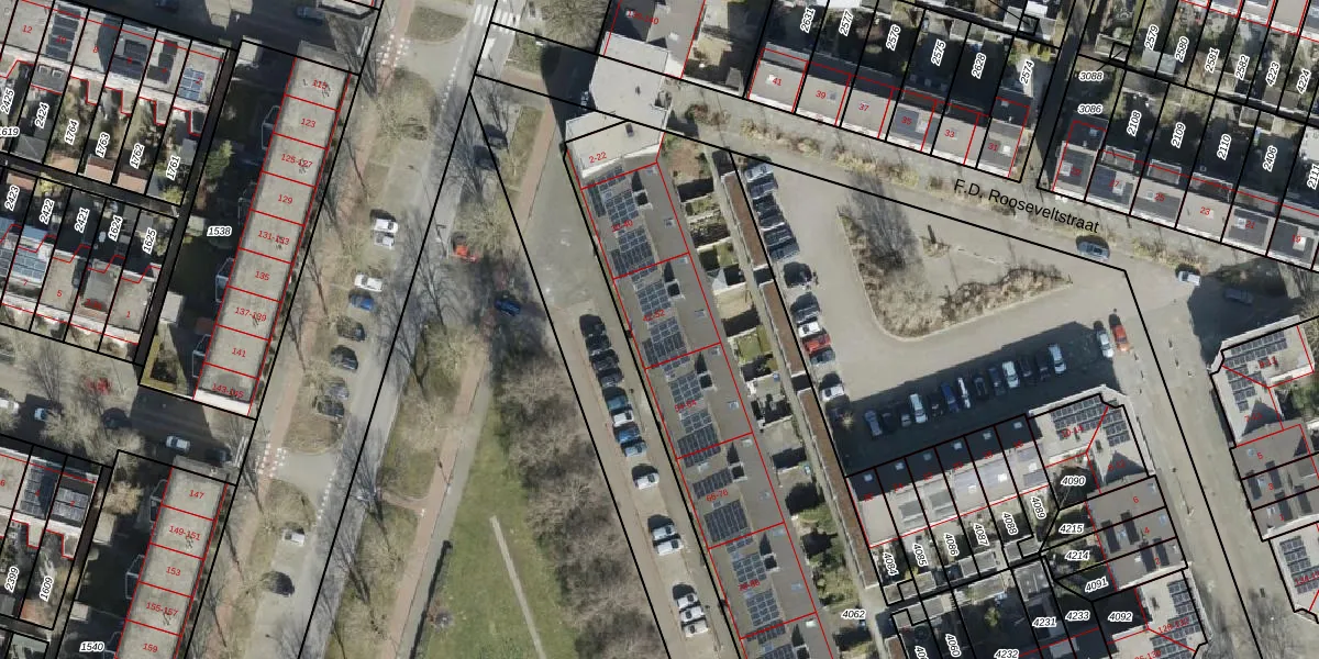 Het perceel waarop D.D. Eisenhowerstraat 52 staat heeft een oppervlakte van 2565 m². Dit is een zeer groot perceel. De perceeloppervlakte wordt geregistreerd door het Kadaster. Gedetailleerde informatie over de maten van dit perceel kunt u vinden in het rapport Kadastrale kaart met maatvoering van D.D. Eisenhowerstraat 52.