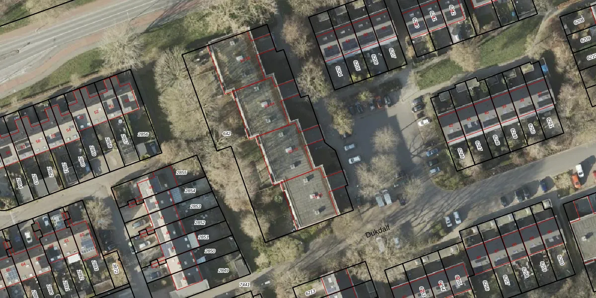 Het perceel waarop Dukdalf 66 staat heeft een oppervlakte van 2201 m². Dit is een zeer groot perceel. De perceeloppervlakte wordt geregistreerd door het Kadaster. Gedetailleerde informatie over de maten van dit perceel kunt u vinden in het rapport Kadastrale kaart met maatvoering van Dukdalf 66.